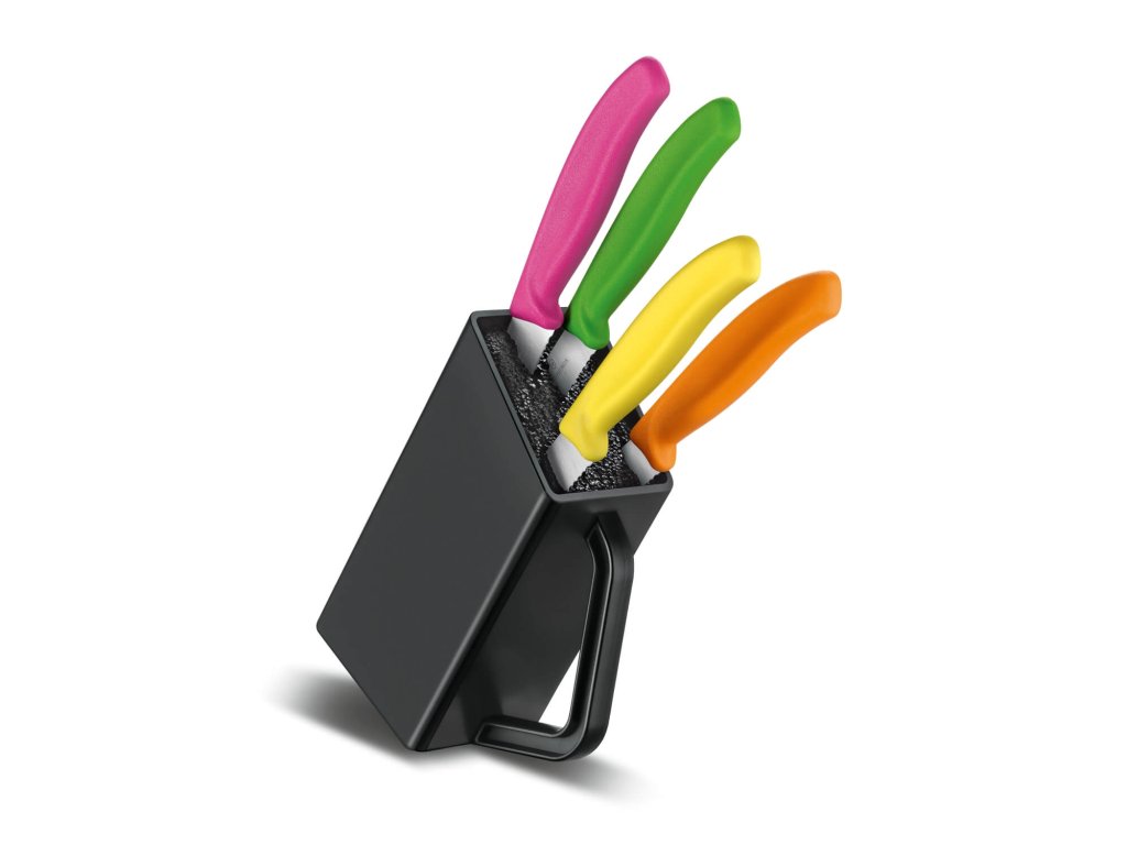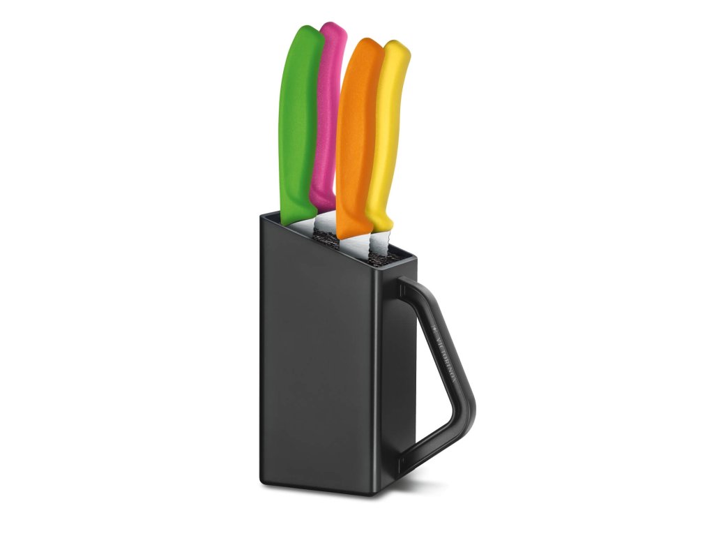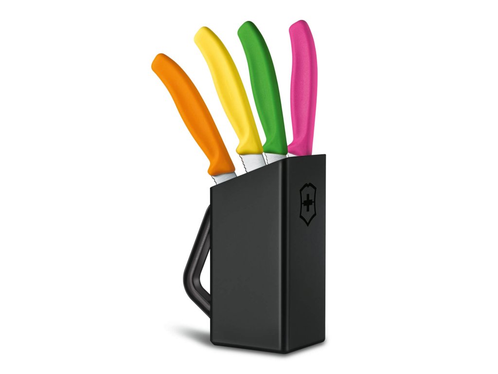 Vneste na stůl barvu a funkčnost s úhledným blokem nožů na steaky a pizzu Swiss Classic. Každý ze čtyř kusů této sady stolních nožů má ultra ostré vlnkované ostří určené pro snadné krájení steaků a pizzy. Jsou dodávány v bezpečném úložném řešení, které