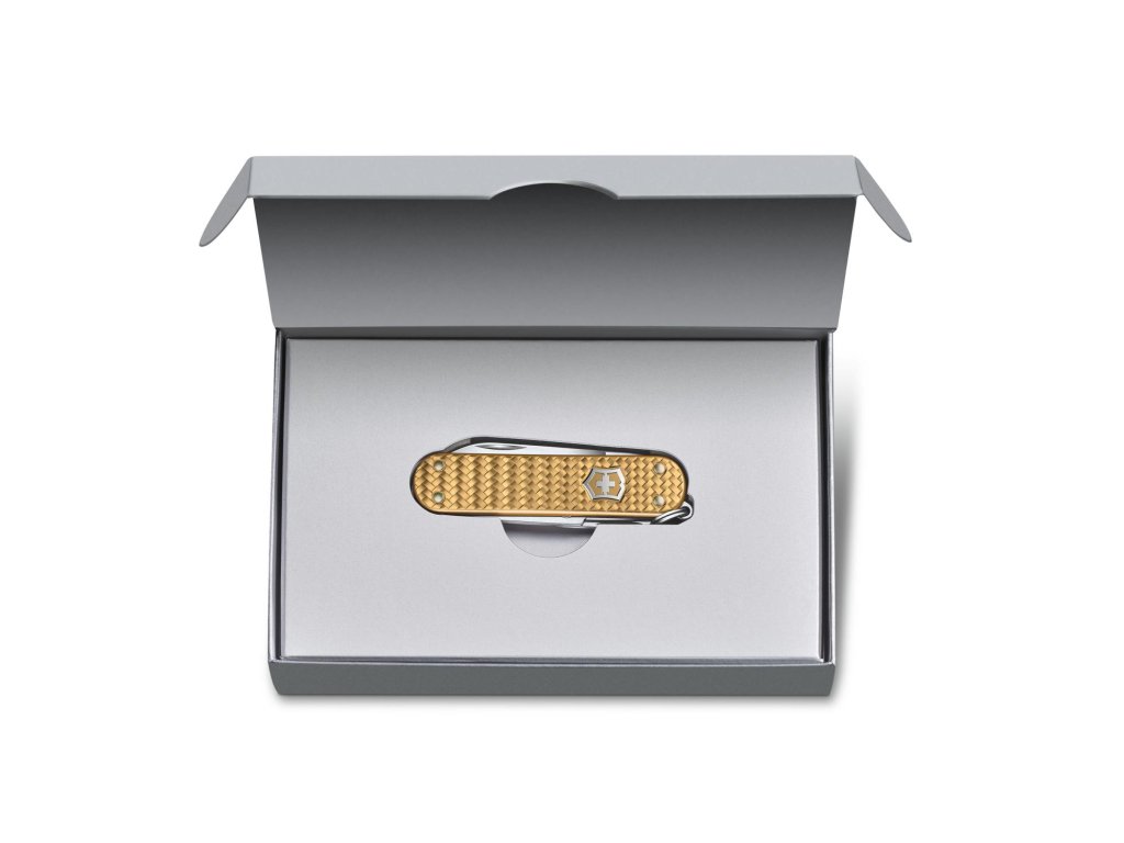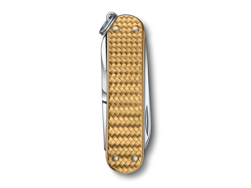 Švýcarský kapesní nůž Victorinox Classic Precious Alox Brass Gold je luxusní malý kapesní nůž s 5 funkcemi, inspirovaný ikonickým modelem Classic. Anodizované hliníkové střenky Alox s tkaným vzorem dodávají noži jedinečný vzhled a vysokou odolnost.