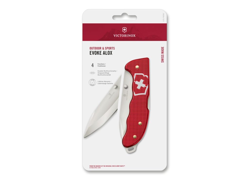 Kapesní nůž Victorinox Evoke Alox Red – odolný nůž kolekce Evoke s aloxovými střenkami, uzamykatelnou čepelí, odnímatelným kolíkem na palec, klipem a otvorem na šňůrku. Hmotnost 189 g.
