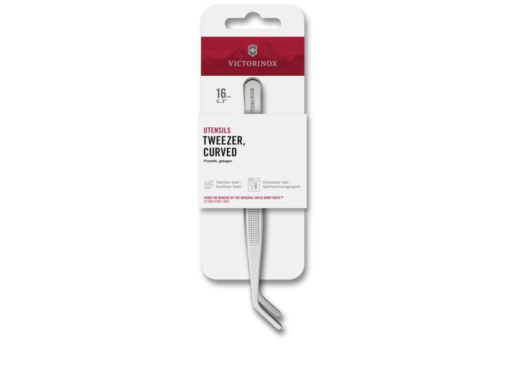 Kuchyňská pinzeta Victorinox zahnutá špička 16 cm – pinzeta na servírování se zahnutou špičkou pro přesnou manipulaci s drobnými surovinami. Nerezová ocel zajišťuje dlouhou životnost a hygienické použití. Vhodná do myčky i profesionální kuchyně. Rozměry 160 × 10 × 10 mm.