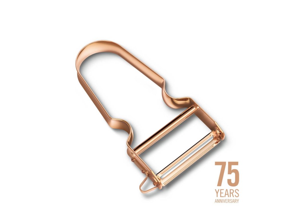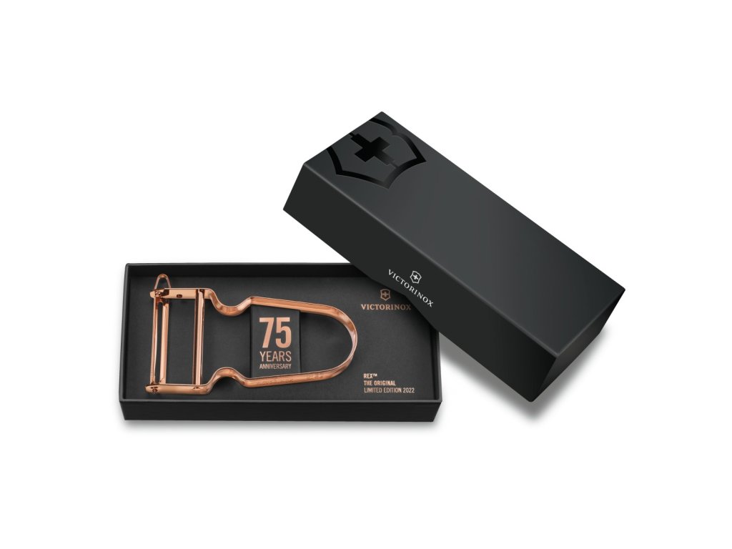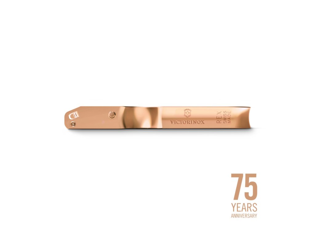 Ikonická škrabka Rex přichází v luxusním provedení v limitované edici pro rok 2022, zároveň je i oslavou 75. výročí značky Victorinox. Na první pohled doslova oslní nádherným povrchem potaženým 18karátovým růžovým zlatem. Zároveň je ozdobena gravírovan