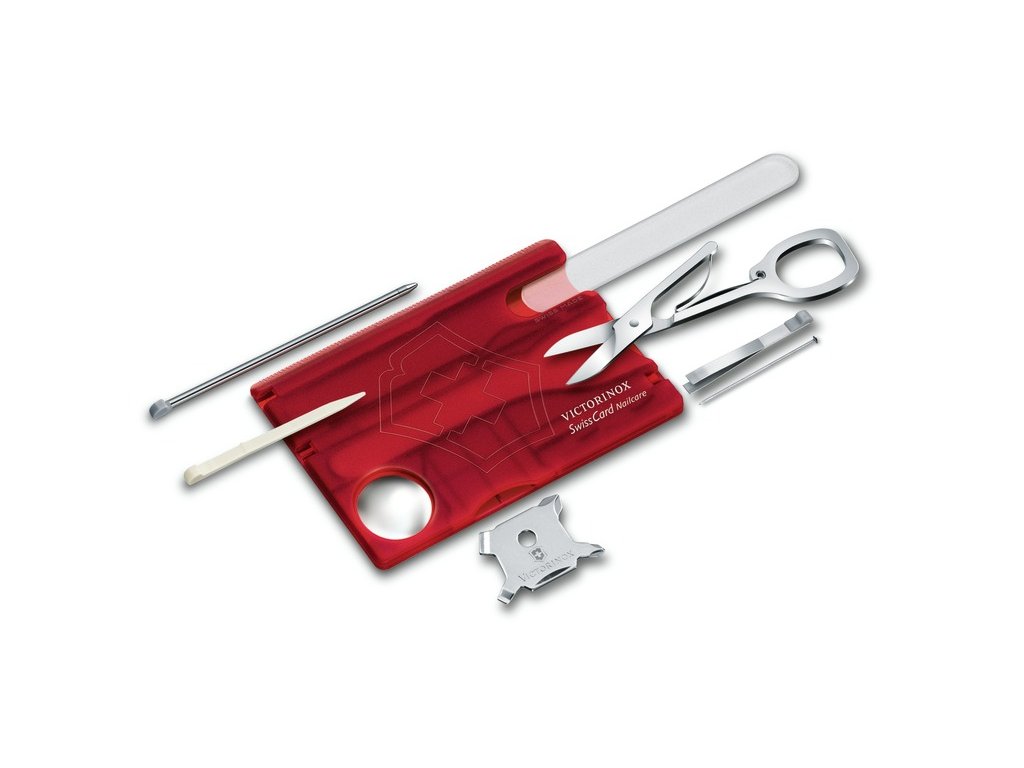 Funkce: | Křížový šroubovák, Párátko, Pinzeta, Výstružník, průbojník, Mini-šroubovák, Pilníček na nehty, Nůžky, Tlakové kuličkové pero, Špendlík, Lupa |